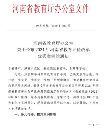 近日,河南省教育厅办公室公布了2024年河南省教育评价改革优秀案例评选结果。我校质量发展处完成的《基于内部质量保证体系建设的高职院校教育评价改革》和化工学院完成的《基于“融入产业、集群发展”的专业群建设实践与评价》教育评价改革优秀案例均荣获二等奖。